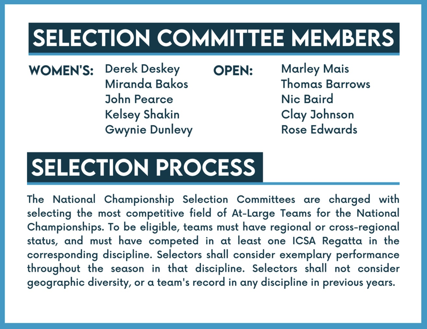 On April 15, ICSA announced the selected teams for both Open and Women’s Team Race Nationals.