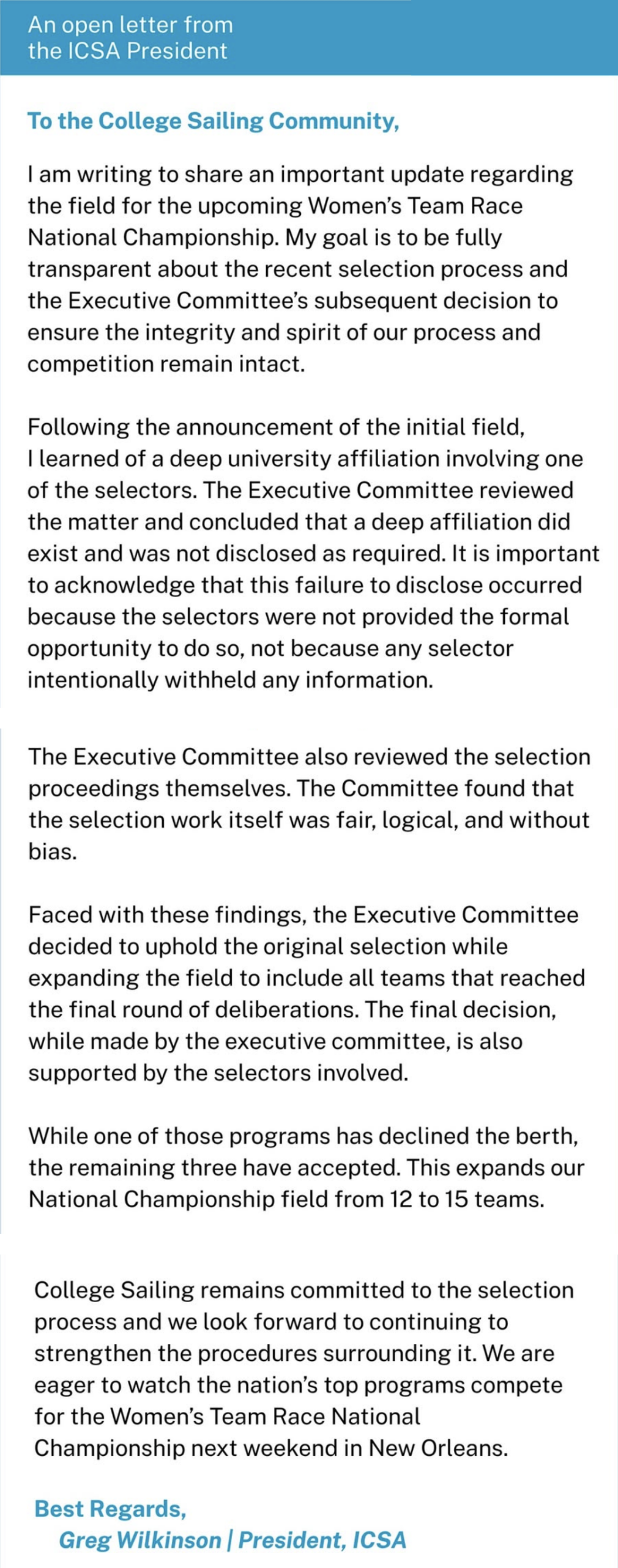 In that statement, the ICSA Executive Committee acknowledged an undisclosed “deep university affiliation” involving one of the selectors after the field had already been announced. While the committee maintained that the original selections were “fair, logical, and without bias,” it still chose to expand the field to include additional teams from the final round of deliberations. With one team declining, the championship will now be sailed with 15 teams.