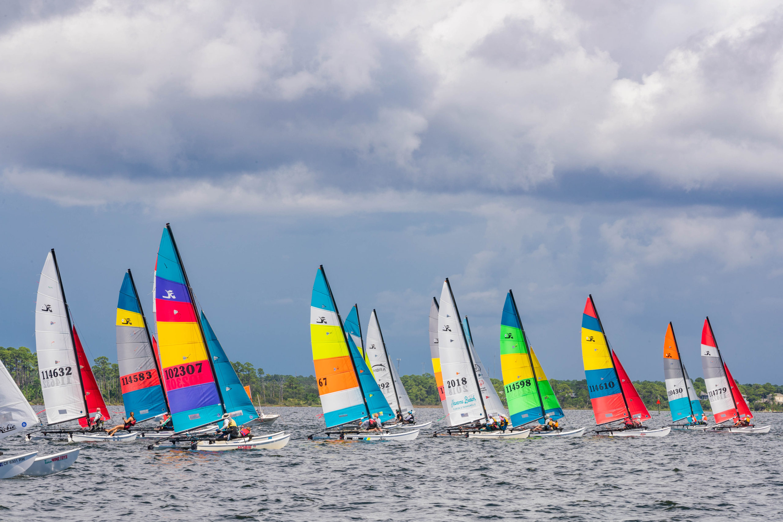 The 2018 Hobie 16 North American Championships came to and end this past weekend at Navarre Beach in Florida. 67 teams from from across North America competed in the five day event which held mainly light wind conditions. The layout of the sailing area caused the race officers to run a split fleet format with teams seeded in four flights and competing in two starts per race. This format was run for the first three days of racing and then the fleet was split into gold and silver for the final two days of the championships. Taking first place was Enrique Figueroa and Melisa Gann of Puerto Rico. Figueroa and Gann dominated the event, winning with a total of 48 points and finishing almost 30 points ahead of second place boats at 77 points. A four way tie ensued for second place. The tiebreaker resulted with Mark Modderman and Alexander Liu of the USA in second, and Pat Porter and Heather Matthews of the USA in third place.