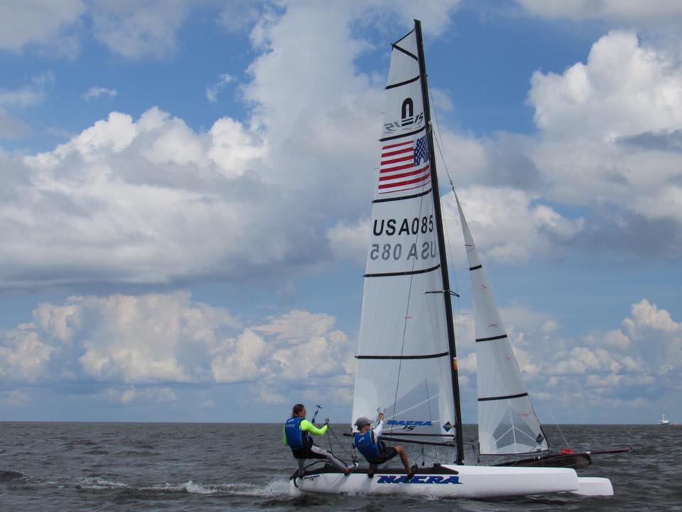 The first day of racing kicked off at noon with unusual winds for summer on Lake Ponthcartrain with 10-12 knots from the southeast with an occasional gust of up to 19 knots. “The Nacras were flying!” said PRO George Hero. George Hero also mentioned that everyone on the race committee was amazed at how fast the boats accelerate from a dead stop to full on top speed. The first race was a two lap windward-leeward course with a windward mark that was .8 miles upwind which lasted about 30 minutes. The second race finished closer to 40 minutes with a longer windward mark at 1 mile. The good breeze held for the afternoon and the race committee was able to get 4 races in.
